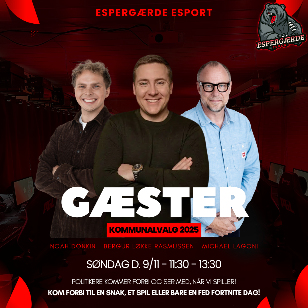 På søndag d. 9/11 kl. 11:30–13:30 får vi besøg af tre politikere – Noah Donkin, Bergur Løkke Rasmussen og Michael Lagoni – der alle har en stærk forståelse for, hvor vigtig esport og gaming er for unge mennesker og fremtiden 💪